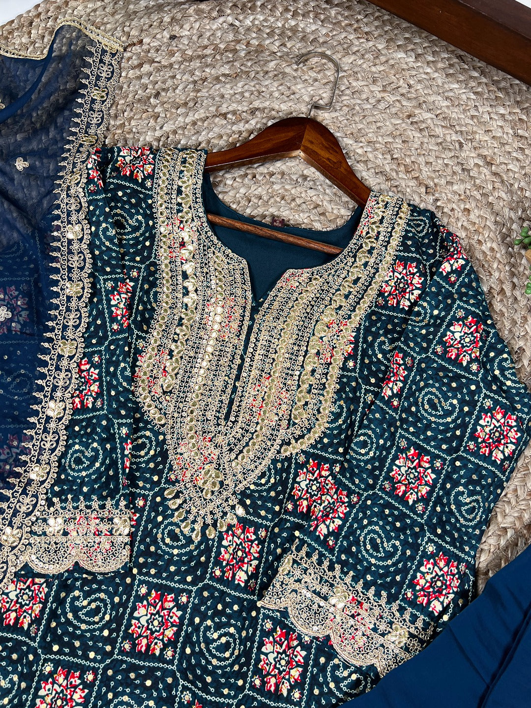 Teal Rayon Embroidered Salwar Suit with Organza Dupatta – Sequins & Thread Work